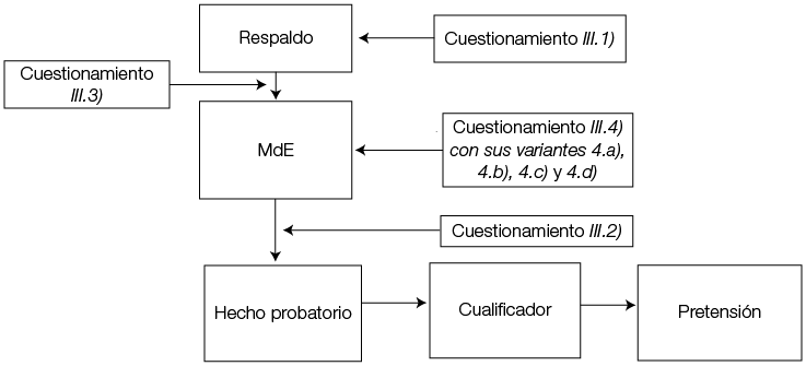 De esta manera, cada tipo de cuestionamiento abarca a uno de los elementos del esquema argumentativo de la prueba o a las relaciones entre ellos. Estas vías integran las maneras en cómo se pueden objetar MdE.